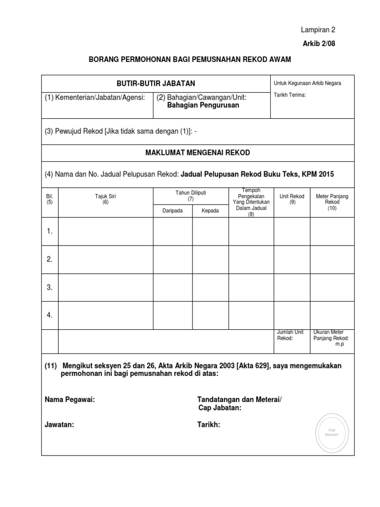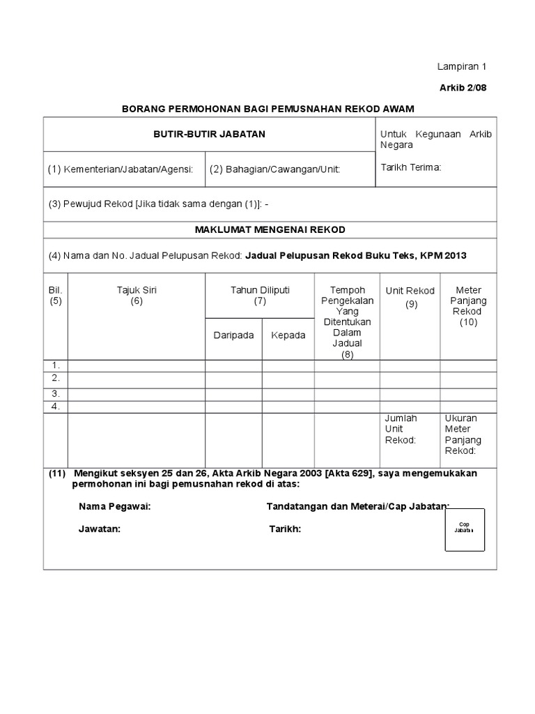 Dalam jagaan atau di bawah kawalan arkib negara malaysia yang ditubuhkan di bawah akta arkib negara 1966. Jadual Pelupusan Rekod. Susunan jadual pelupusan rekod urusan am 4 9.