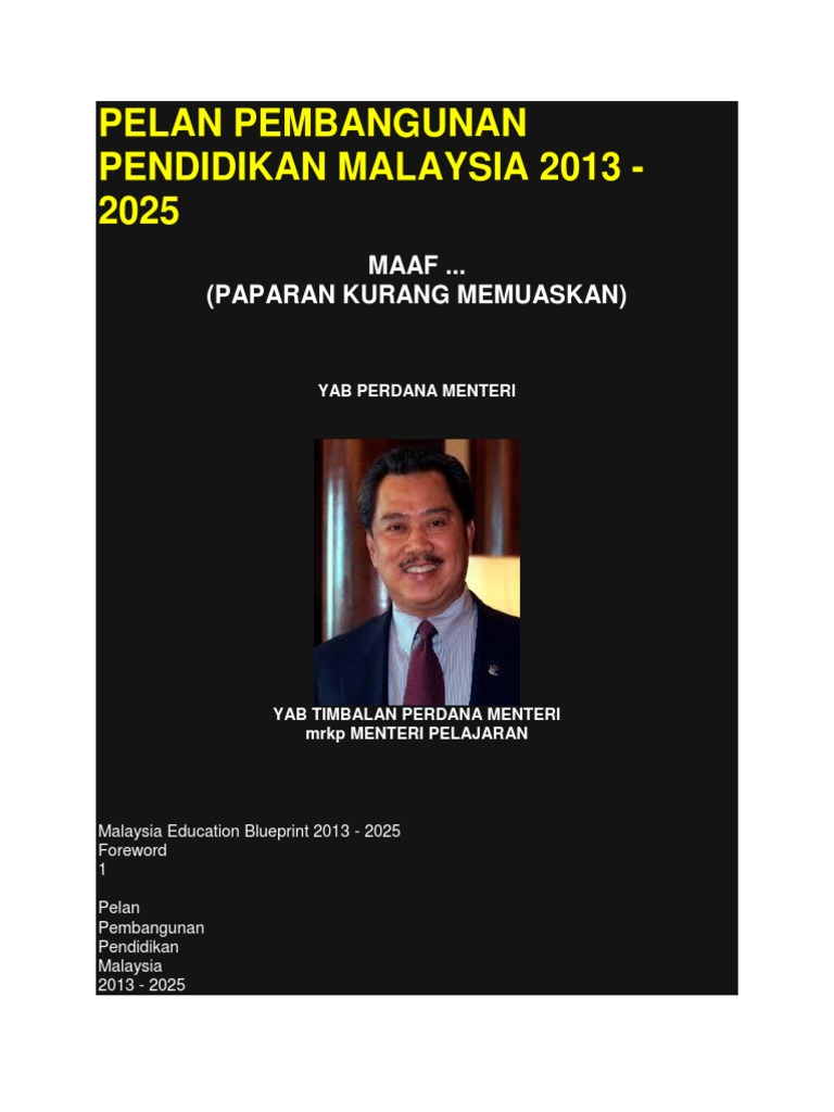 Malaysia Education Blueprint 2013 - 2025 Foreword KEBERHASILAN11 Pelan Pembangunan Pendidikan Malaysia 2013-2025 telah menetapkan dengan jelas sasaran yang perlu dicapai dari segi kualiti ekuiti dan akses dalam tempoh 13 tahun. Setiap tahun kerajaan memperuntukan peratusan yang besar daripada perbelanjaan. Check Pages 1 - 50 of 1.