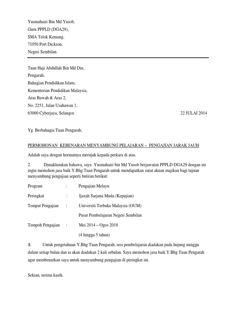 Bila dah dapat surat tawaran penuh dah boleh sambung belajar dengan senang hati. Surat mohon cuti tanpa rekod via scribd contoh surat permohonan kerja melalui ketua jabatan www via kotasurat contoh surat permohonan asrama via slideshare contoh surat sokongan majikan untuk sambung belajar via scribd contoh surat rasmi tidak hadir ke sekolah surat cuti sakit via djdanchef. Kemudahan ini disediakan oleh Kerajaan sebagai satu galakan kepada pegawai agar dapat melengkapkan diri dengan pengetahuan yang lebih tinggi sejajar dengan keperluan untuk mewujudkan pekerja berasaskan pengetahuan knowledge-based workers.