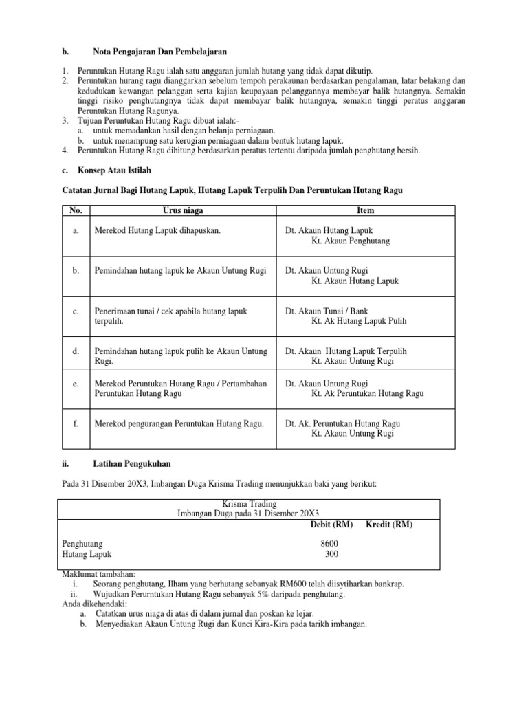 Peruntukan Hutang Ragu hanya melibatkan pengiraan atas jumlah penghutang sahaja tetapi akaun penghutang tidak terlibat di mana akaun yang terlibat ialah. Peruntukan hutang ragu -Peruntukan hutang ragulapuk adalah satu anggaran tentang sejumlah hutang yang mungkin tidak akan dapat dipungut - cara membuat rekod perakaunan a. Beban hutang lapuk adalah jumlah akaun belum terima yang tidak dapat ditagih.