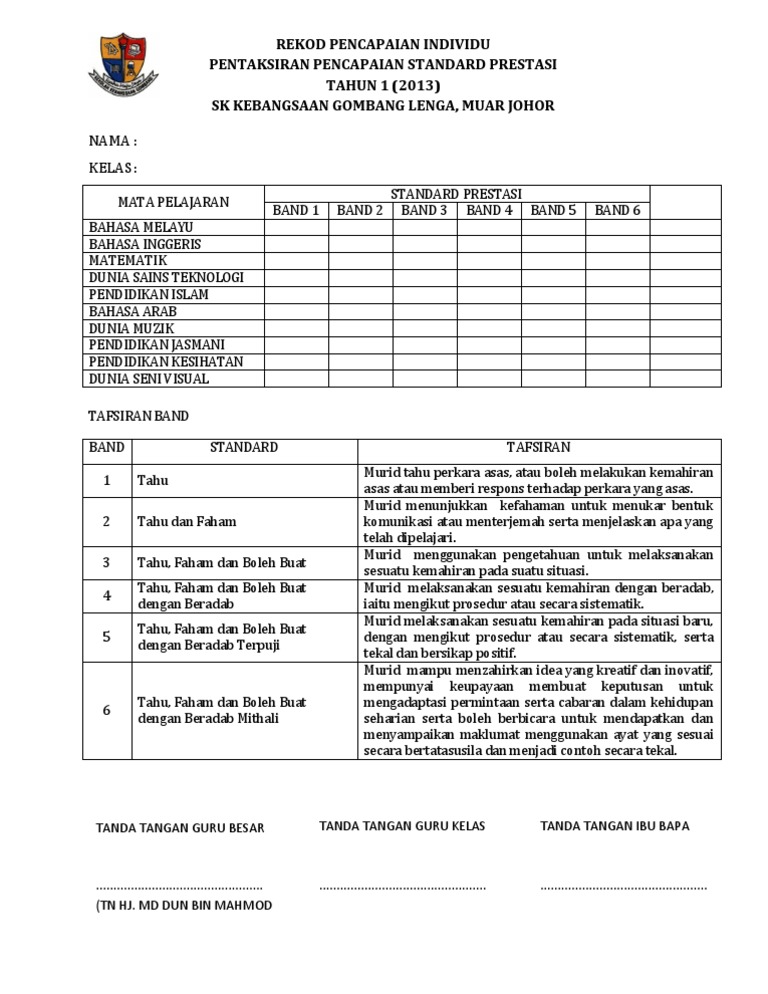 Pentaksiran yang dirancang dibina ditadbir diperiksa dan dilapor oleh guru di sekolah yang melibatkan murid ibu bapa dan organisasi luar. Templat Pelaporan RBT Tahun 6. Kurikulum standard sekolah rendah.