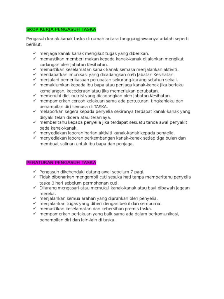 TASKA mempunyai peraturan untuk dijadikan panduan oleh ibu bapa penjaga pengusaha pengurus penyelia pengasuh pendidik petugas di TASKA dan lain-lain orang yang terlibat dengan pengurusan TASKA e. Perkhidmatan mengasuh kanak - kanak. Rekod kesihatan kanak kanak.